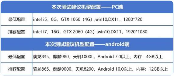 移动端最低的配置是安卓7.0以上的版本,并且要保证自己的CPU,已经达到了骁龙835亦或是麒麟980以上,内存方面,玩家需要预留4GB以上的内存空间,并且储存空间要预留20GB。