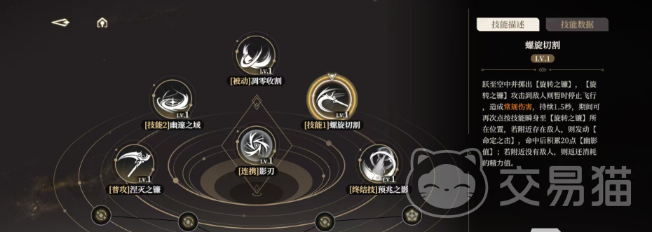 1技能名为螺旋切割,这个技能需要伊蕾什安对敌人投掷自己的武器镰刀,敌人会受到镰刀带来的飞行伤害,技能的攻击时间只有1.5秒,在这个攻击的持续时间内,只要不断的点击技能,我们就能闪现到镰刀所谓的位置,若是周边出现了对手的话,还可以进行命定攻击,只要命中对手就能获得幽影值。