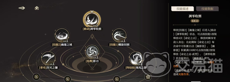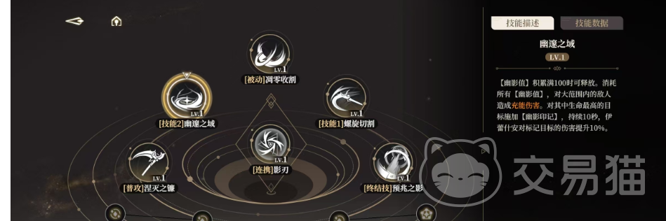3技能名为凋零收割,这也是伊蕾什安的被动技能,该技能一旦被释放就会立刻进入到收割的状态,在这个状态下可以不断的用命定之击攻击对手,连续点击4次命定之击还可以直接瞬移到敌人的跟前,使用凋零收割技能,每一次打到敌人都能获得35点的幽影值,当幽影值累计满了后,还可以使用二形态的命定之击。