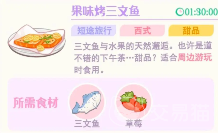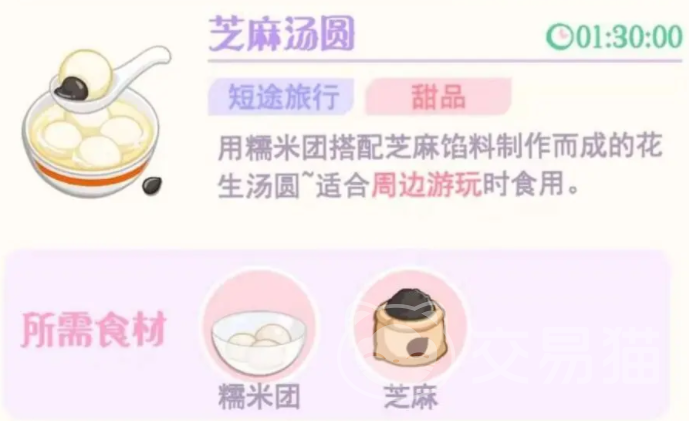 在一些短途旅行中角色也会非常偏爱甜品,就比如黑旋风,这是一个适合在短途旅行使用的甜品,制作这个食物使用的食材非常简单,只需要使用芝麻和奶油就可以,另外还有花生汤圆、芝麻汤圆,这两种都需要糯米和花生或者芝麻,相对来说比较复杂一些的,就是草莓奶冻冰,要用奶油,草莓和红糖这三种食材,即使不是甜品,也需要增加很多奶油或者是水果,就比如果味烤三文鱼,需要三文鱼和草莓这两种食材。