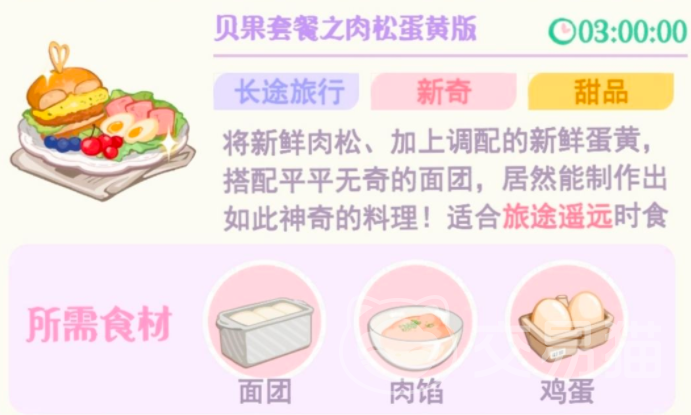 想要培养好Paki,那就需要多准备一些牛奶,水果或者是糯米粉,这样才能制作出角色比较喜欢的食物,另外也可以准备像面团肉馅或者是鸡蛋芝士这样的食材,这样角色在长期旅行的时候,就可以制作贝果套餐之肉松蛋黄版,这是也是一种比较新奇的甜品。
