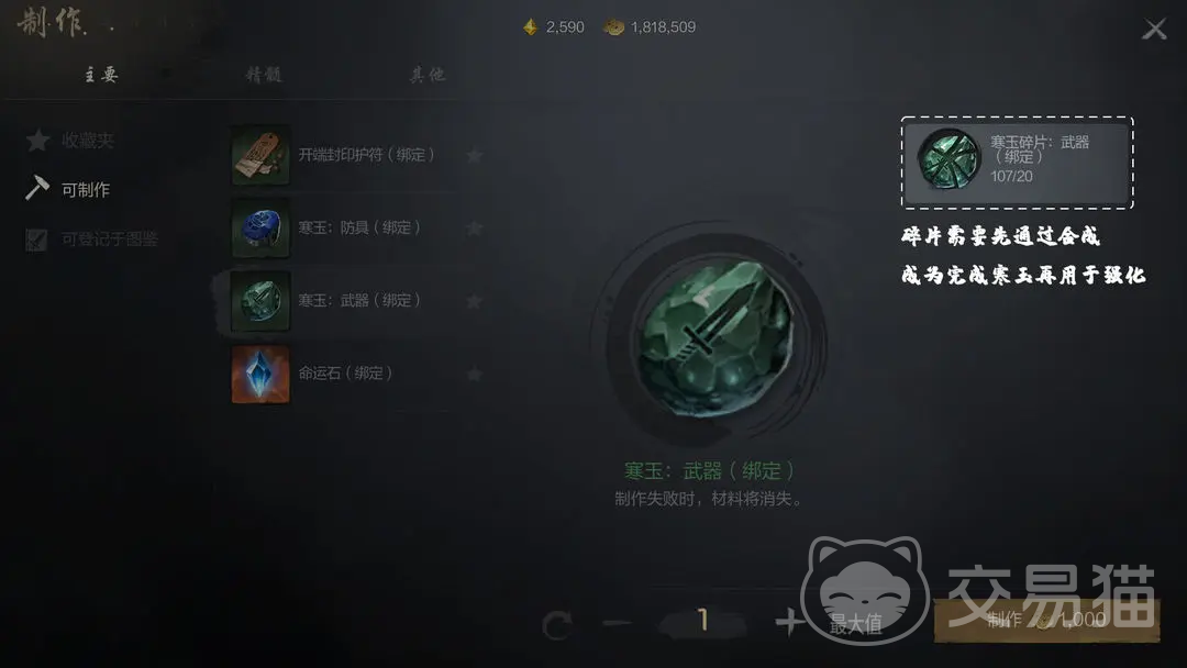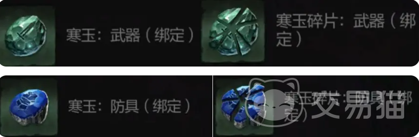 装备强化主要分为武器和防具两类,这俩需要消耗的道具材料也不同,武器强化使用”寒玉:武器”,防具强化需要消耗”寒玉:防具”。加入获取的是”寒玉碎片:武器”,或者”寒玉碎片:防具”,也能通过制作合成来拿到完整的寒玉再用于强化。