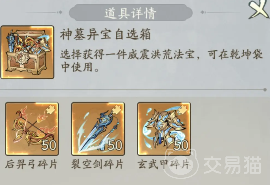 同时活动还会开启神墓异宝自选箱。玩家们可以通过这个自选箱来选择传说级别的法宝,后羿弓,裂空剑和玄武甲。玩家们如果缺少哪一个法宝的话便可以考虑使用自选箱来获取它们。