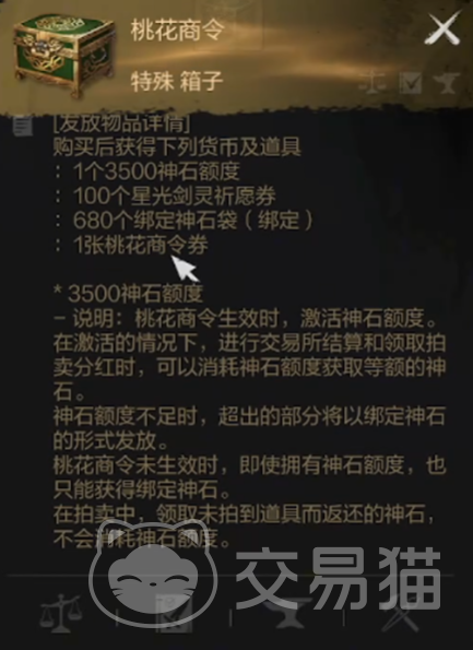 如果大家想要解锁桃花商令的话,那么就需要充值68块钱。也能够解锁交易所中流通神石的获取权限,那你才能够通过交易所拍卖的方式获得更多的神石。所谓的神石就跟游戏充值的点券一样,有了之后就可以让大家无需氪金,就可以购买商城内的道具。