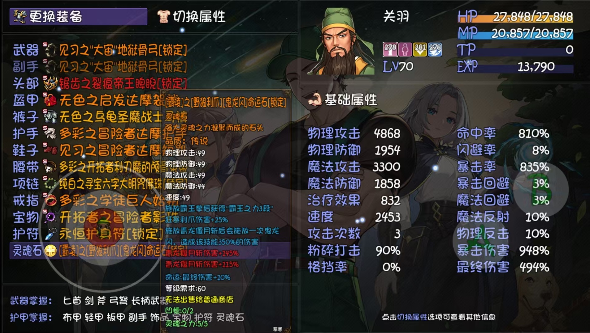 第3个推荐的是关羽和女武神,关羽和女武神都是刷秘境时经常使用到的人物,尤其是关羽目前非常强力,技能动画快,装备搭配灵活,成型简单,只要有一个斩龙闪灵魂石就可以带来巨额输出。另外还有一个技巧,就是如果带有物反、魔反或免死等词缀时,没有太好的办法,直接退出避免浪费时间。