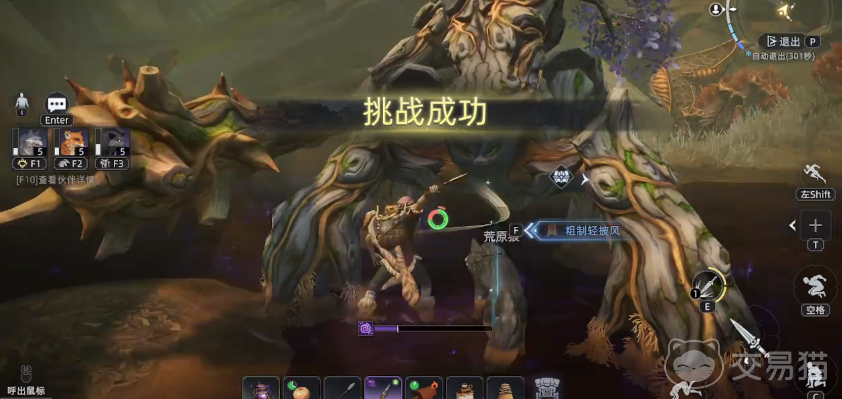 随着树妖血量进一步减少,它将进入强化阶段。此时,树妖身体会浮现紫黑色花纹,其攻击将附带暗属性。当玩家受到树妖攻击时,屏幕下方会显示一条可累积的能量条。而且树妖攻击速度加快,为防止一次性累积过多能量条,建议玩家与树妖保持较远的距离,让荒原狼主动发起攻击。随后,趁着树妖攻击的间隔,玩家迅速往前冲刺,攻击其四肢,通过这种方式逐渐消耗树妖血量,直至成功通关挑战。