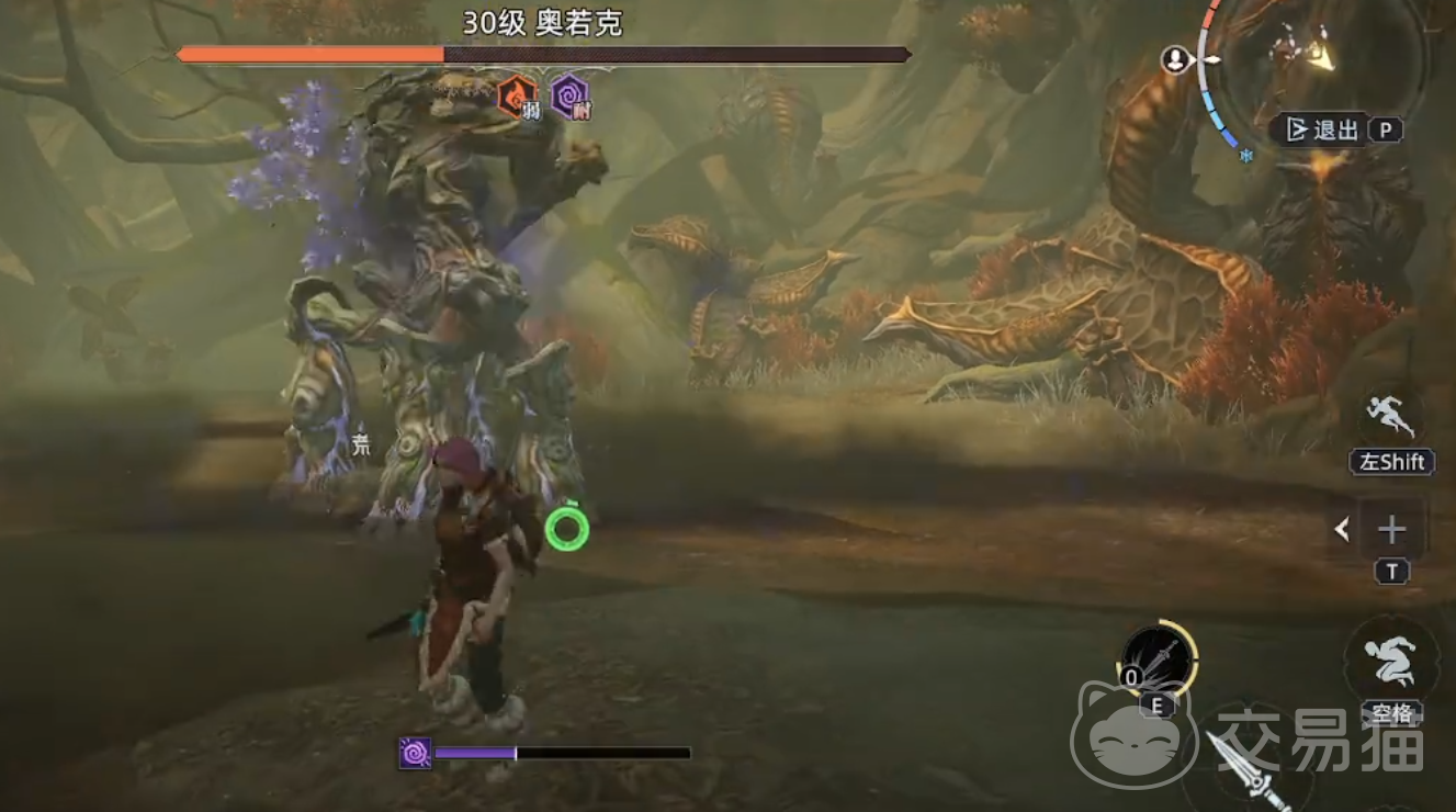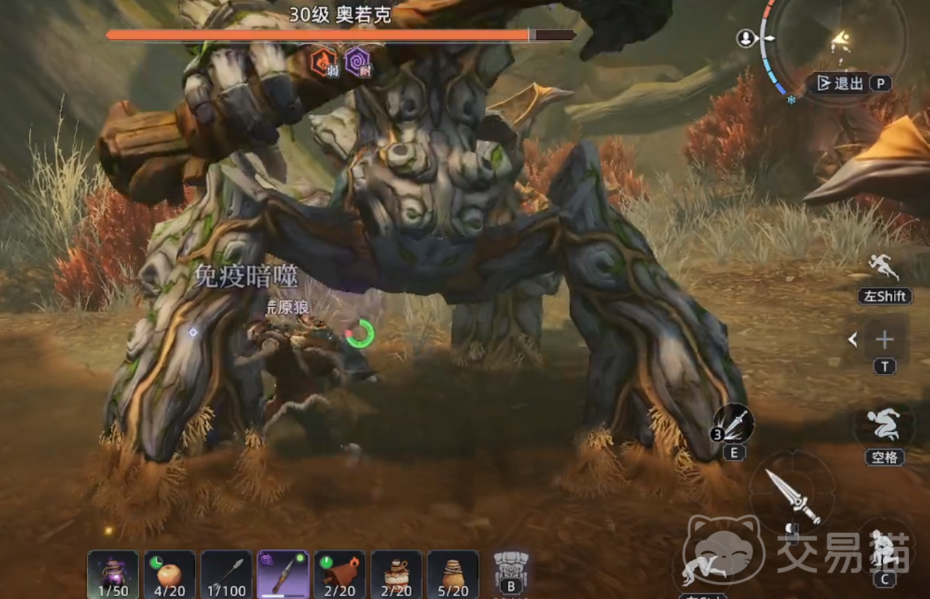 树妖奥若克有着一套完整且规律的攻击模式。当玩家靠近时,它会挥舞手中大棒发动攻击。此时,若玩家手持匕首,可优先攻击树妖的4条腿。树妖的攻击存在明显前摇,当看到它脚下有挥舞大棒的动作预兆时,玩家迅速摁下后退闪避键,便能轻松躲开攻击。值得一提的是,在玩家闪避的同时,所携带的宠物狼会自动对树妖进行攻击,补充一定伤害。由于树妖的特殊属性,它对暗噬技能免疫,玩家在战斗中要避免使用此类技能。