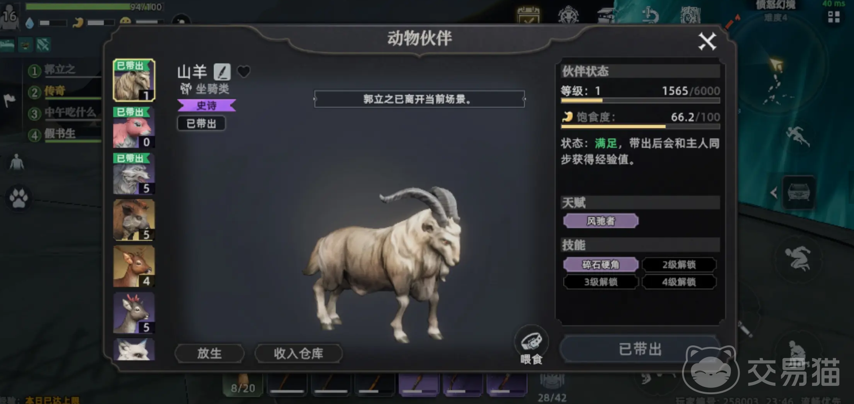山羊就是第三只推荐的宠物,它的能力主要体现在石头采集方面,它凿石头的速度很快,能高效的收集石头的原材料,而前期的房屋建造,以及一些必备的工具都是将石头作为原材料的。