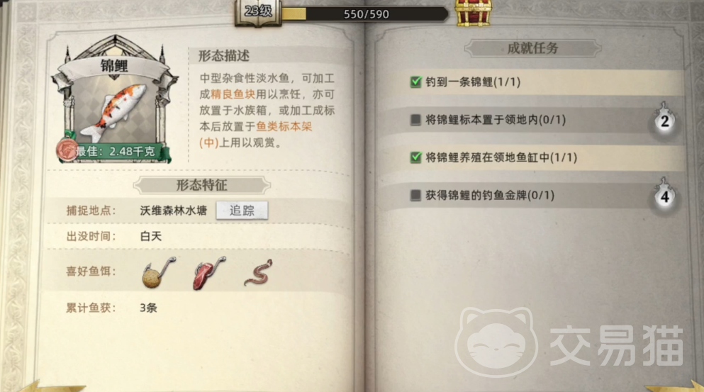 森林内鱼塘:鲶鱼与斑马鱼,全天活跃,三种饵料都行。白天,有锦鲤,三种饵料都行。