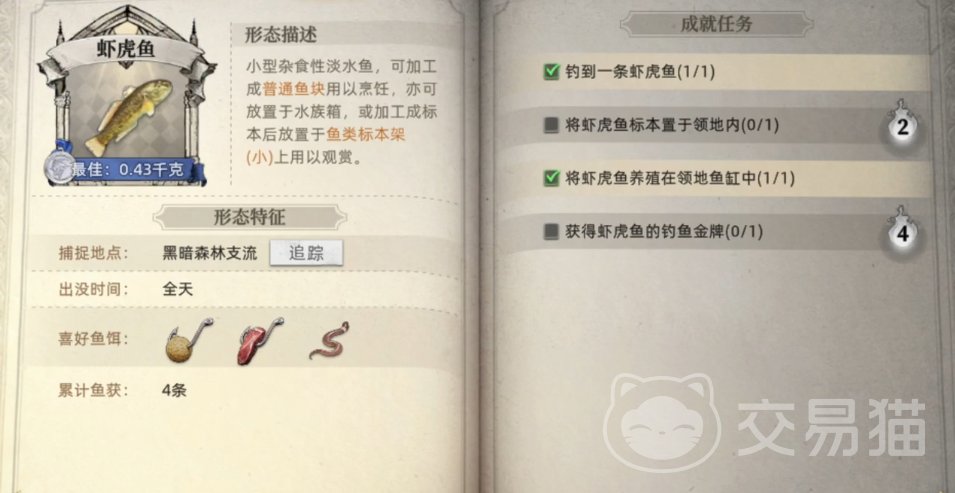 黑暗森林支流:泥鳅和虾虎鱼全天活动,可以用三种饵料来钓。夜晚,有虎纹鸭嘴鲇出现,只对肉饵感兴趣。