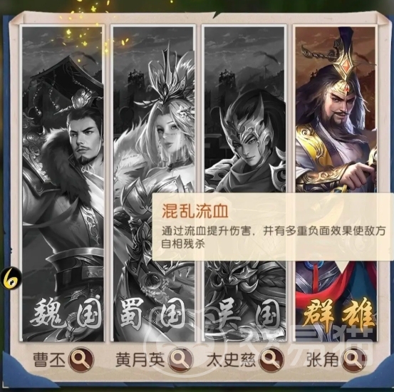 如果小伙伴们自己知道阵容该如何搭配的话,那么前期可以尝试使用群雄阵容,主要特点就是流血增伤,但有一定的控制能力,而且能够带来阵容加成,只要队伍内的武将超过三名,那么大家就会得到攻击力和兵力方面的提升,如果队伍里有5名群雄,那么大家就可以提高流血的概率。