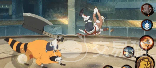 阿三有一个特殊机制,那就是开局和一只叫胖太的浣熊一起出战,属于骑乘状态,使用一技能可以切换为站立状态,两种状态下普攻和技能都会有所不同,他的普攻在骑乘下总共会打七下,第二下比较特殊能击飞,站立则是4下,其中3A会抓住敌人重摔,4A是将敌人重砸向地面。