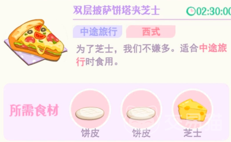 在中距离旅行的时候,角色会经常选择培根卷饼,芝士肉饼或者是芝士吐司,这些食物需要准备芝士,面包,肉馅饼皮这样的食材,另外角色还非常喜欢。各类的披萨或者是贝果,比如最常规的经典意式窑炉披萨,需要用饼皮,肉类和芝士制作,另外还有双层披萨饼塔夹芝士,需要两个饼皮,一个芝士就能制作完成。