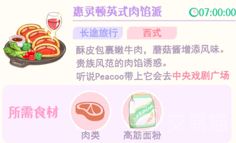 另外就是惠灵顿英式肉馅派,这是一个适合长途旅行的西式食材,想要制作这个食物,就需要消耗肉类和高筋面粉,制作出来的成品非常惊艳,酥皮会包裹着嫩牛肉,这种鲜嫩是喜欢西式料理的人无法抗拒的,角色会带上这个食物去中央戏剧广场,食物制作的食材比较常见,只不过这两种事物比较耗时,都需要7个小时才能制作完成。