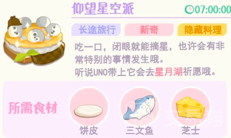 除了常规的菜品之外,这个角色还比较喜欢仰望星空派,需要饼皮,芝士三文鱼进行搭配,是一个造型非常奇特的食材。
