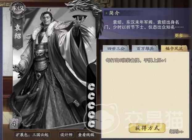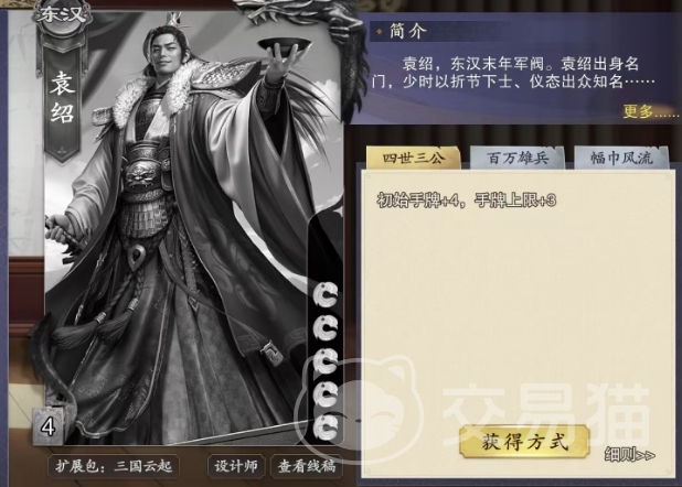 在众多武将中,袁绍他的三个技能相互配合,能够为击杀创造极为合理的条件,因此被广泛认为是第一梯队的武将强度卡,其中四世三公作为他的一技能,更是让人眼前一亮,这个技能初始手牌+4,手牌上限+3,其效果非常直观且强大,在游戏开始时,袁绍就能拥有比其他武将更多的手牌,这意味着他有更多的资源和机会去发动攻击、防御或执行其他出牌策略,同时手牌上限的提升也保证了他能够更好地保持手牌数量,避免因手牌不足而陷入被动局面。