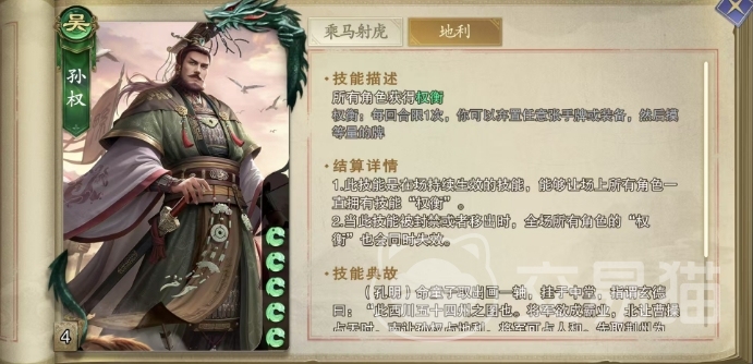 且地利技能还隐藏着一个额外的策略是大家可以用的,那就是每当一名角色累计摸了4张牌以后,地利技能会触发一个特殊的效果,此时会让该角色先执行一个出牌阶段,在这个过程中,玩家可以先摸一张牌,然后可以选择打出一张杀,这种设计也是为玩家提供了更多的进攻机会,所以说孙权这张卡其实可以发起进攻的机会还是很多的,就看大家怎么调整这几个技能的效果。