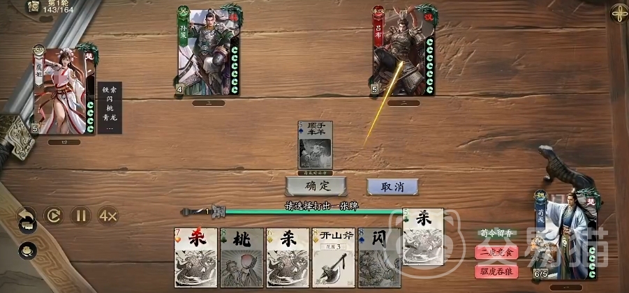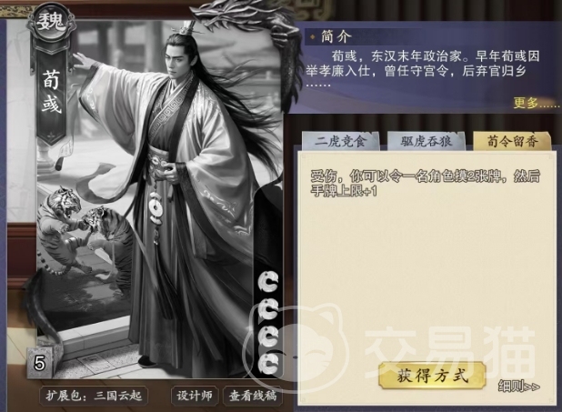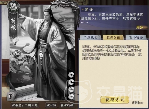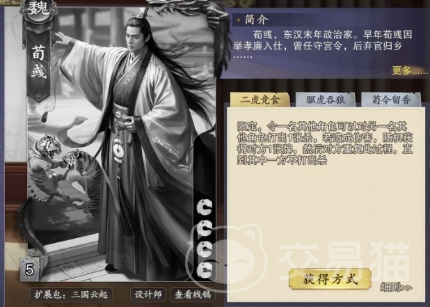 荀彧的第二个技能驱虎吞狼同样是一个限定技能,它让两名其他角色进入一场激烈的阵前对决,在这场对决中,荀彧会巧妙地操控战局,让双方互相厮杀,直到其中一方重伤为止,而这一切都不需要使用那张令人畏惧的阵前对决牌,当这两名角色在荀彧的精心策划下展开对决时,荀彧又会巧妙地将另一名角色卷入其中。