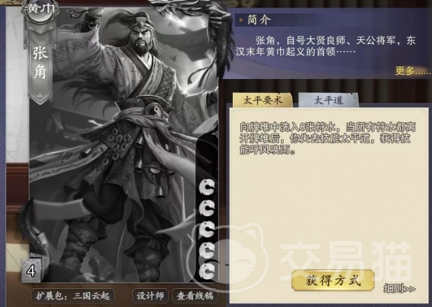 他的太平要术是第一个技能,太平要术的核心机制,在于向牌堆中巧妙地洗入8张符水,这些符水并非寻常之物,它们带有治愈力量,当张角发动此技能时,所有的符水便会悄然融入牌堆,而一旦这些符水因各种缘由离开了牌堆,张角便将失去太平道技能,符水的效果极为独特,当它们被某个幸运的角色获得时,会立即自动打出并消失。