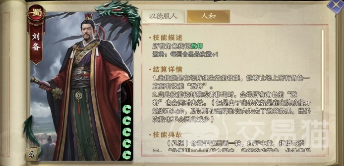 此技能是在场持续生效的技能,能够让场上所有角色一直拥有技能激将,就是用的时候大家要注意当此技能被封禁或者移出时,全场所有角色的激将也会同时失效,但是由于出杀次数是在出牌阶段开始时重置的,所以即使出牌阶段内失去了激将效果,出杀次数也不会因此减少,然而当出现特殊情况导致仁和技能被封禁或者是从游戏中被移出时,场上原本因该技能而拥有激将效果的所有角色会瞬间失去这一加成,出杀次数回归正常状态。
