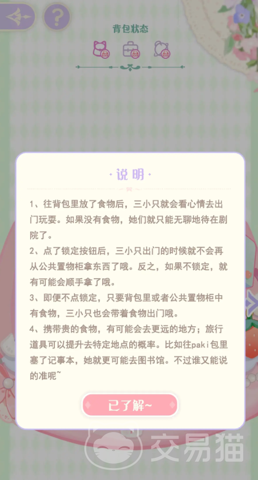 小背包也就是三个角色的背包,这个背包里的所有东西都需要玩家来帮忙收拾,无论是背包里装旅行的道具还是装各种食物都需要玩家自己来决策,因为三个小演员的特色各不相同,爱好也不一样,擅长的表演也不同,所以每次小演员出门之前玩家都要根据演员的不同来收拾不同的背包,无论是小背包的外观还是里面的物品都要满足小演员的需要。