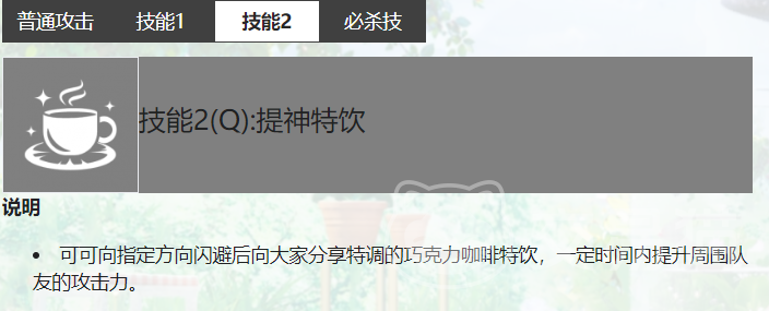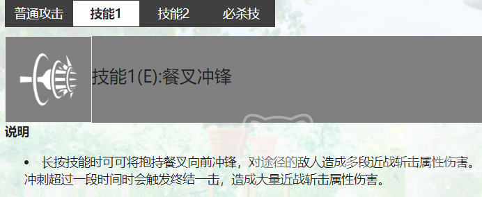 艾美·可可的1技能在使用的时候,对敌人进行多段的近战伤害,并且在她使用技能的这一段途径中也会对敌人造成伤害,由于角色的设定这个技能释放是用餐叉,非常可爱。技能2是一个群体增益技能,能够对于队友附加攻击力提升的buff。