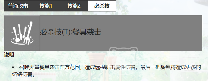 必杀技是可可的终极大招,也是一个范围性的技能。在释放的过程中会召唤大量餐具对敌人进行攻击,进行远程的斩击伤害,最后在进行必杀技的斩杀。随着这些技能的升级能够将技能威力提升,范围和数值都会得到质一般的飞跃,可可这个角色在游戏中值得玩家进行培养。
