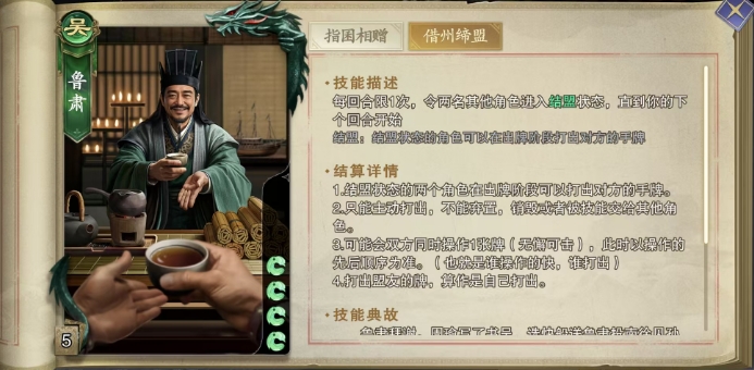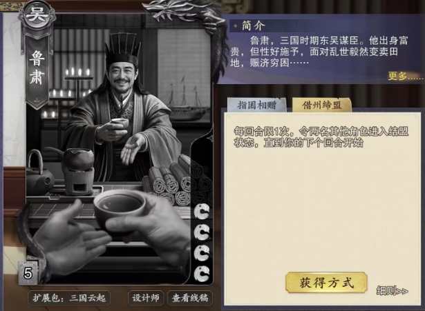 鲁肃还有一个颇为独特且具有策略性的技能—叫做借州缔盟,这是他的第二技能,这个技能的施展有着明确的频率限制,即每回合仅能使用1次,也就是说这是一个限定技能,当玩家决定发动借州缔盟这一技能时,便能够指定两名其他角色,使其进入一种特殊的结盟状态,这种结盟状态会一直持续,直到该玩家的下一个回合开始,才会解除。