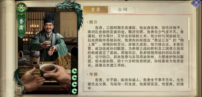 在代号杀的三国卡牌世界里,有一位智谋超群的东吴阵营谋臣叫做鲁肃,代号杀鲁肃怎么样大家要是了解过他出奇制胜的计策就知道了,这个武将至少在智力上面大家是不用担心的,而且根据武将独特的事迹,在目前的游戏当中设计了与人生事迹相关的技能,这一点也让很多玩家想要用这张卡。