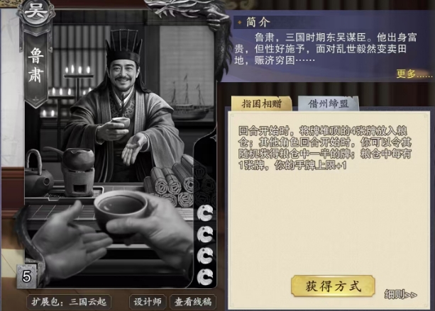 值得注意的是,这里的一半在牌数为单数时会向下取整,但至少保证该角色能获得1张牌,此外粮仓中的牌不仅是一种资源储备,还直接关联到鲁肃的手牌上限,具体来说就是每有1张牌存放于粮仓中,鲁肃的手牌上限就会相应增加1点,这种变化是即时的,意味着一旦粮仓的牌数发生变动,鲁肃的手牌上限也会随之立刻调整,然而这个手牌上限的提升仅在弃牌阶段发挥实际作用,用于决定鲁肃需要弃置多少手牌以符合新的上限。