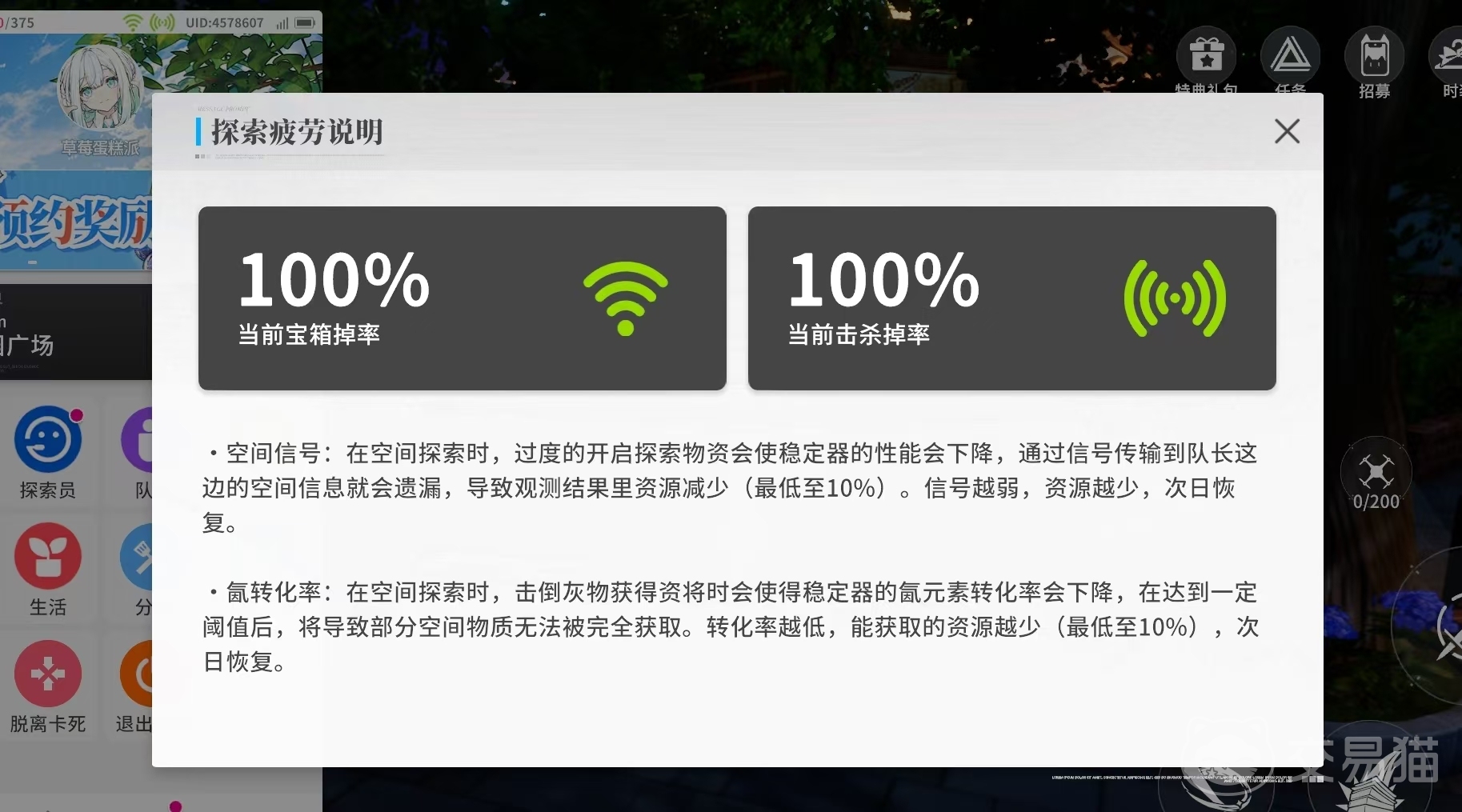 疲劳值在游戏中玩家的影响还是比较大,因为疲劳值的数值是直接影响到玩家在探索过程获取的资源和奖励,目前疲劳值分为空间信号和转化率。空间信号影响的是玩家在游戏汇总获取资源的数量,信号越低获取的资源越少。