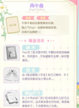 另外在游戏里还会有剧目演出的设定,但想要获得演出资格就需要去游戏里收集特定的物品,只要集齐4个道具之后就可以获得演出许可证,这样角色在相应的时间,去往指定地点之后,就可以上台表演。