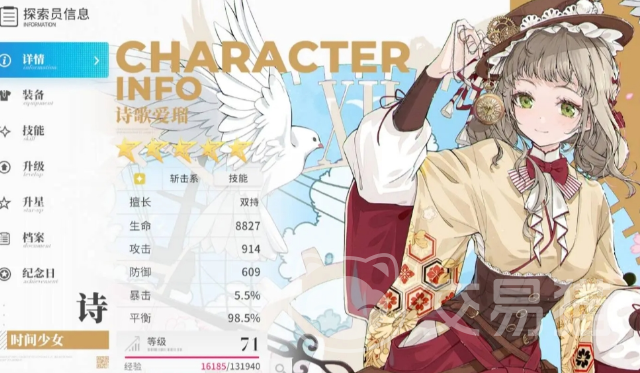 诗在这套阵容中可以作为副c来进行培养,并且这个角色是玩家开局获得的角色。拥有很好的补充伤害和时停技能,在游戏中这个角色想要发挥出较好的实力就必须进行中后期的培养。能够在技能释放结束之后对敌人进行超长的伤害总额,搭配任何队伍都很实用。