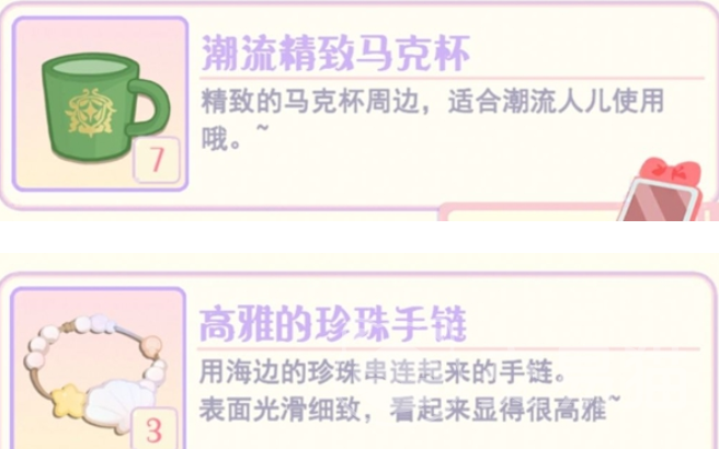Gemi是游戏里非常温柔可爱的一个角色,想给这个角色赠送礼物的话,那就可以选择比较符合对方气质的珍珠手链,这是用海边珍珠穿起来的手链,佩戴之后能显出这个角色的高雅,玩家也可以选择把潮流精致马克杯赠送给对方,另外还有凯丝,这是裁缝铺的店长,这个角色比较喜欢毛茸茸的物品,玩家可以选择把毛茸茸手机挂件赠送给对方。