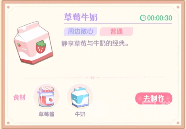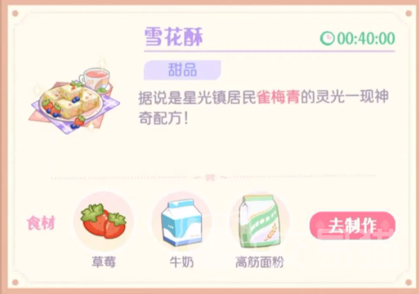 另外可以直接把草莓酱和牛奶搭配起来,这样就能制作出草莓牛奶,是非常适合在周边散心的时候食用的一种饮品,并且只需要消耗玩家30秒的时间,也可以选择把面团和牛奶组合起来,这样就能做成奶香贝果,适合在短途旅行的时候使用,耗时只需要1分钟,另外牛奶还可以搭配草莓和高筋面粉做成雪花酥,这是居民们都非常喜欢的一种甜品。