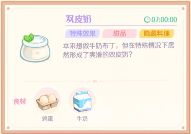 另外牛奶还可以和鸡蛋搭配制作成双皮奶,这是一个隐藏料理,在游戏里需要耗时7个小时,但这个食材能产生特殊效果,玩家可以尝试去游戏里,通过消耗这两种比较基础的食材,制作出双皮奶这种特殊料理。