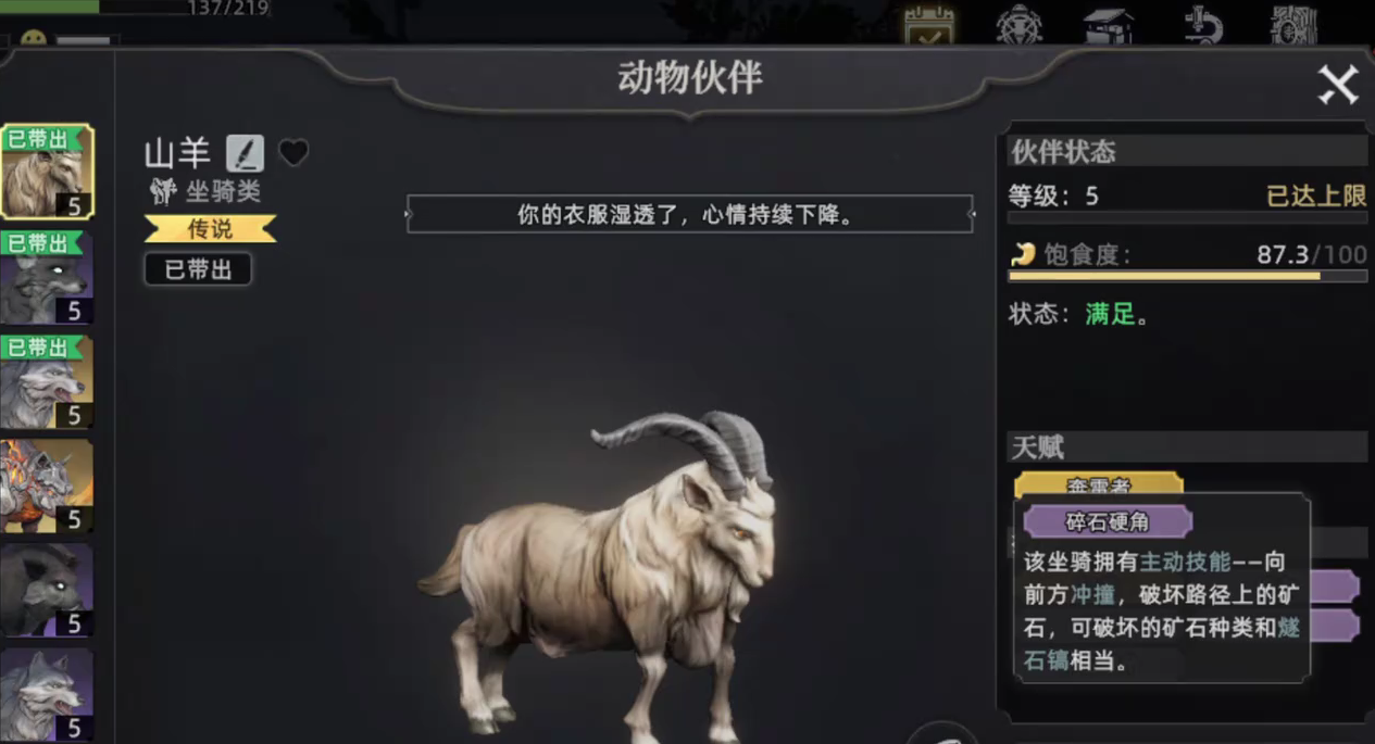 山羊在游戏当中,是适用于凿石的一个宠物,它可以提升玩家进行矿物采集的效率,并且可以协助玩家建造以及制作工具,山羊还附带有各类不同类型的天赋属性,如果玩家获取的是紫色或金色品质的赡养,则可以解锁碎石硬角这一个技能,在搭乘该技能时,山羊可以直接破坏所有的矿石种类,并且其强度和燧石镐是相同的。