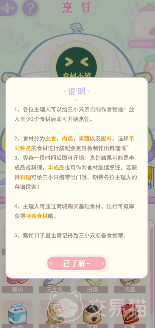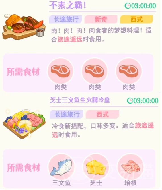 Peacoo偏爱西式料理,玩家想要让Peacoo长途旅行只需要准备不素之霸、黑椒西冷牛排或者是芝士三文鱼生火腿冷盘,有这三种料理给崽崽准备好,崽崽就会进行长途旅行。而UNO则偏爱新奇料理,想要让UNO进行长途旅行也很简单,需要准备不素之霸、猫山王绵绵冰、芝士培根三角包或者是贝果套餐之肉松蛋黄版,提前给背包准备好这些就可以进行长途旅行了。
