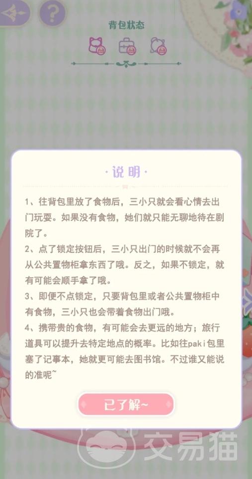 本次小编给玩家们带来的是花花与幕间剧长途旅行介绍,在花花与幕间剧手游中三小只会不定期的出远门,而想要让这三小只进行长途旅行则也有一些前提条件,本期小编就给玩家们介绍一下这些条件,满足了条件才会进行长途旅行,不然这三小只有可能都不会出门,出门才能获得各种道具,所以还是尽量让自己的崽崽出远门。