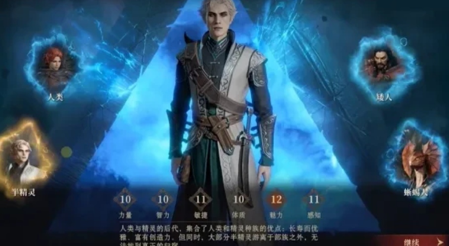 之后就是半精灵这个种族,作为人类和精灵混血后产生的后裔,他的外貌还是非常优雅的,并且还拥有人类的创造力,比较适合对话流以及魅力玩法的玩家们来进行选择,不过这种种族比较缺乏归属感,一般都在社会的边缘,体质比较的低,战斗能力也非常的弱小,如果想要更好的发挥实力,必须要依靠强大的战术来进行运用,他的魅力属性还是非常高的,可以帮助大家后续在对话以及交易。