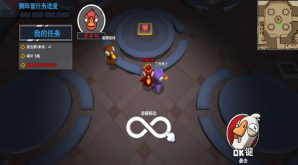 这款游戏是很好玩的,玩家就会分成三个不同的阵营。如果是鹅阵营,那就需要完成所有的任务,并且需要淘汰所有的鸭子。如果是鸭阵容,就需要通过搞破坏的方式将所有的鹅消灭,一般都是选择欺骗或者是暗杀的手段。鹅阵营玩家同样也可以去完成一些小任务,例如清理小垃圾或者是修理设备,任务的进度条满了之后则意味着获胜。