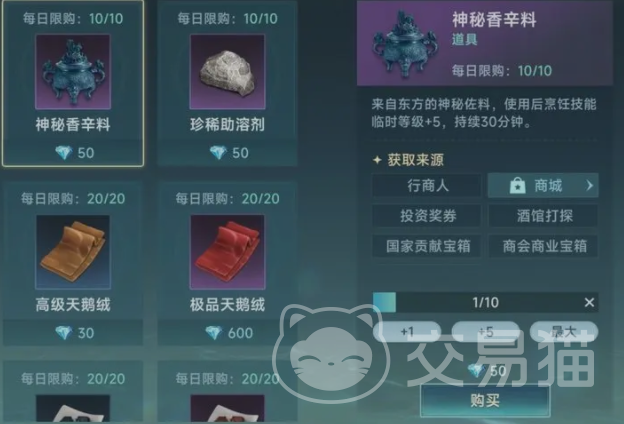 对于烹饪来说最重要的就是神秘的香辛料,需要在游戏里花费50钻石购买,并且每天每个人只限购10个,获得这个道具之后,玩家个人的烹饪技能就能提升5点,但是只能提升30分钟,所以在购买之后就需要及时使用,借助这个技能,可以在海尔德用羊制作出羊奶,还能让鸡变成鸡蛋,另外用奶和盐加起来可以变成奶酪,在其他地区,也可以直接把各类的动物,直接变成肉类,然后肉类加盐可以变成腌肉。
