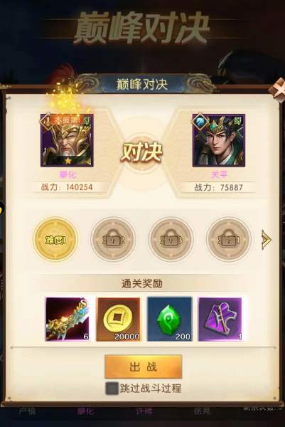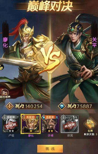 三国问鼎山河巅峰对决在游戏中是玩家获取到神器材料道具的副本,玩家筹够神器的材料就可以制作神器,为整体武将的实进行质一般的飞跃。巅峰对决是随机抽取4为武将进行1v1对决,因为存在随机性若出现玩家木有的武将,玩家不能使用该武将进行挑战。