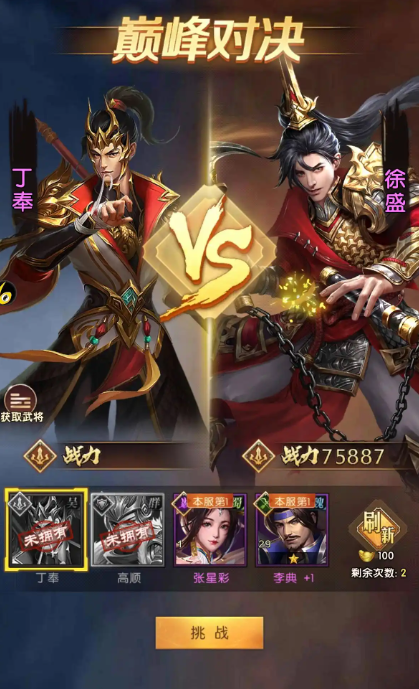 随机刷新出来的武将,玩家是呀进行挑战的。刷新很容易出现战斗力爆表的角色,首次的刷新是免费的。但是后期的挑战,武将刷新就要消耗玩家在游戏中的货币俩进行兑换。武将的培养很关键,在战斗上傲视群雄也能做巅峰对决中完败刷新武将。