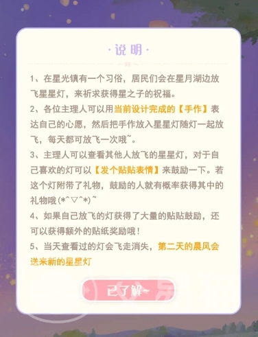 制作星星灯这个活动是在星光镇上解锁的玩法内容,这个镇上的居民会通过放飞星星灯来许下自己的愿望,同样的玩家们解锁了星星灯的玩法之后,也能通过星星灯来表达自己美好的愿望。玩家每天都有一次放飞星星灯的机会,在放飞后还能查看其他人星星灯内的愿望,对于自己感兴趣的内容还能通过发贴贴的表情来表达自己的鼓励,在点赞的时候会有机会获得随机贴纸礼物。