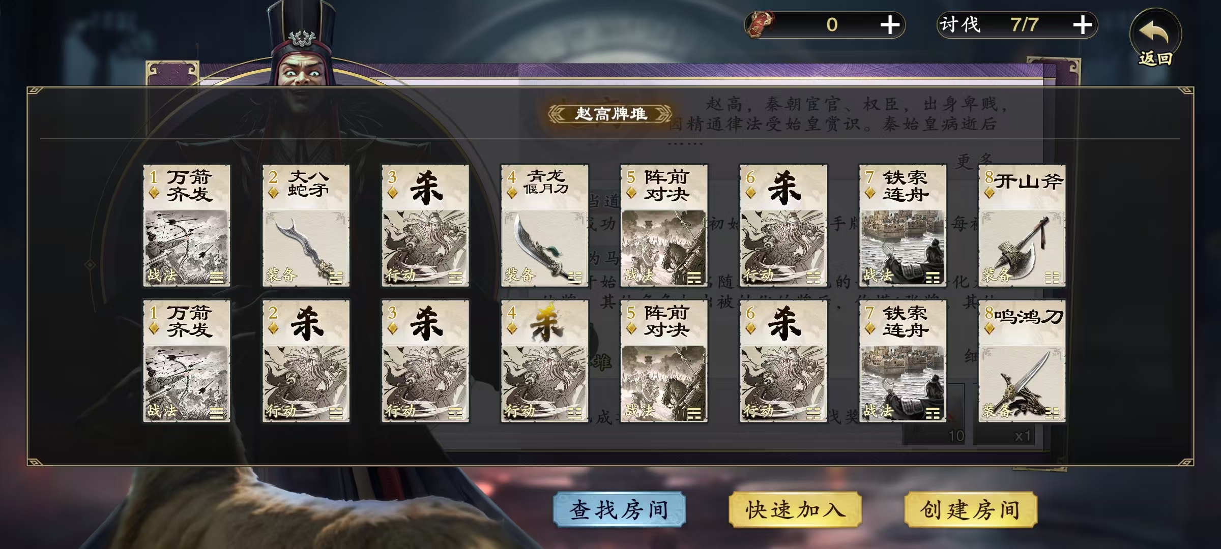 第3个技能沙丘之变,当其他角色阵亡时,赵高将获得对方手里所有的牌,包括手牌和装备区的牌以及卜卦区的牌,并立即开始回合。在此回合之内,其他角色无法响应打出的牌,此回合结束时有几率恢复所有体力,赵高每被讨伐成功一次,技能中的概率增加1/21。除了搞清楚这个技能效果之外,大家还可以通过活动页面,直接查看赵高所拥有的独特牌,这样找到其中一些比较特殊的牌先查看一下效果也有助于战胜目标。