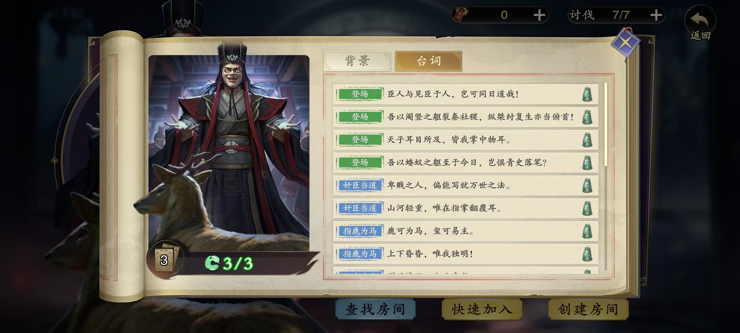 赵高一共有三个特殊技能,第1个奸臣当道,第2个指鹿为马,第3个沙丘之变。第1个技能的效果是每被成功讨伐1次,初始体力就会增加1点,手牌上限增加1,每被讨伐成功2次,初始手牌加1,每回合出杀次数加1。讨伐次数是和当前挑战房间的房主讨伐次数相关,所以可以更换房主来降低难度。