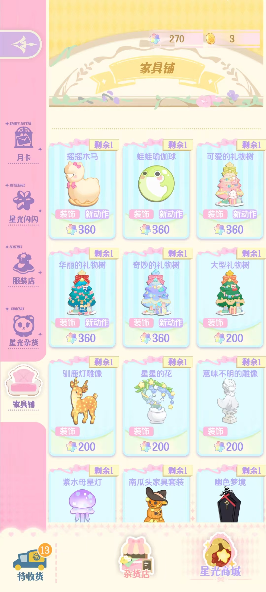 上面所说的是免费获取的方式,如果免费获取的不够使用,那么接下来就只能通过充值的方式来得到的。例如开启月卡之后可以立即获得150点星光,在后续每天都可以领取到。当然还有其他一些充值途径,大家根据自身的需求去选择。获取到了这些星光都可以打开星光商城,然后在这里购买各种各样的道具。在这里主要购买的当然是各种各样的漂亮时装,这些时装可以打扮各种角色,是大家孜孜不倦追求的内容。另外还可以在这里购买到很多食物与材料,在特殊时节还会出现限定食材,制作限定料理等。