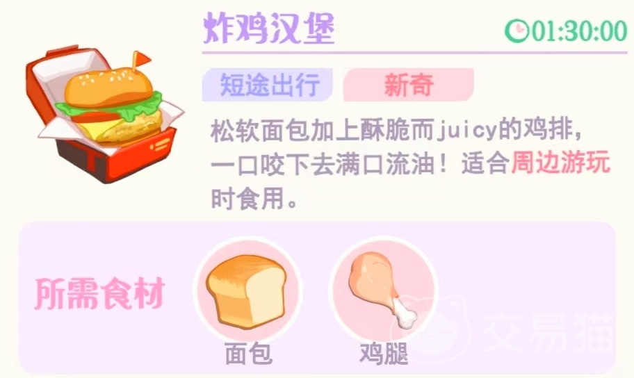中途旅行的时候比较喜欢牛油果奶昔,芝士夹心麻薯、培根蔬菜千层卷、烟熏三文鱼贝果三明治。长途旅行喜欢不速之霸,猫山王绵绵冰,芝士培根三角包,贝果套餐之肉松蛋黄版等。这些食物的制作其实并不算困难,例如糯米参鸡汤,只需要糯米和鸡腿就可以制作出来,炸鸡汉堡需要面包和鸡腿,星光镇鸡肉卷需要饼皮和鸡腿,蔬菜泥青青贝果需要贝果和白菜等。