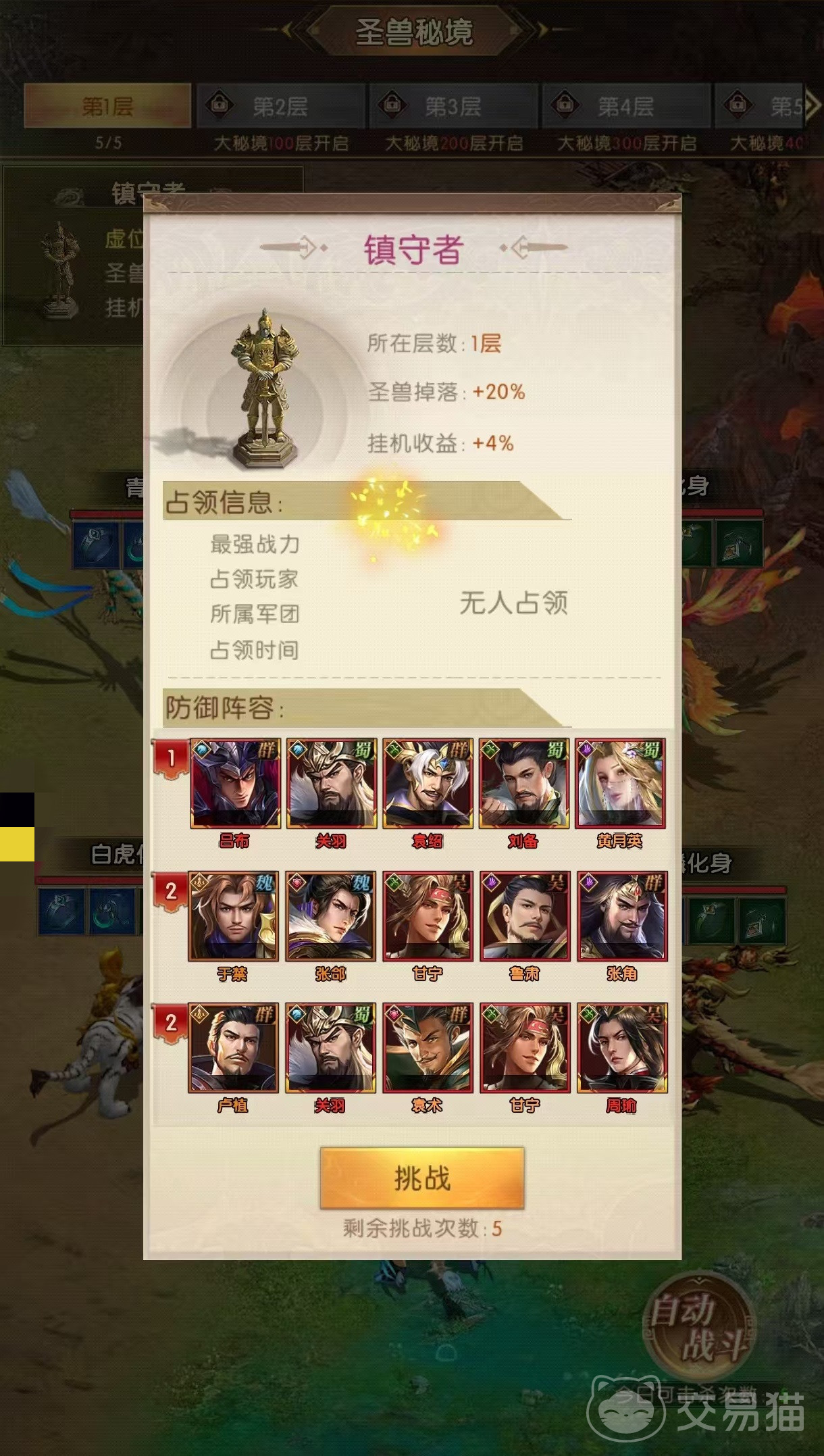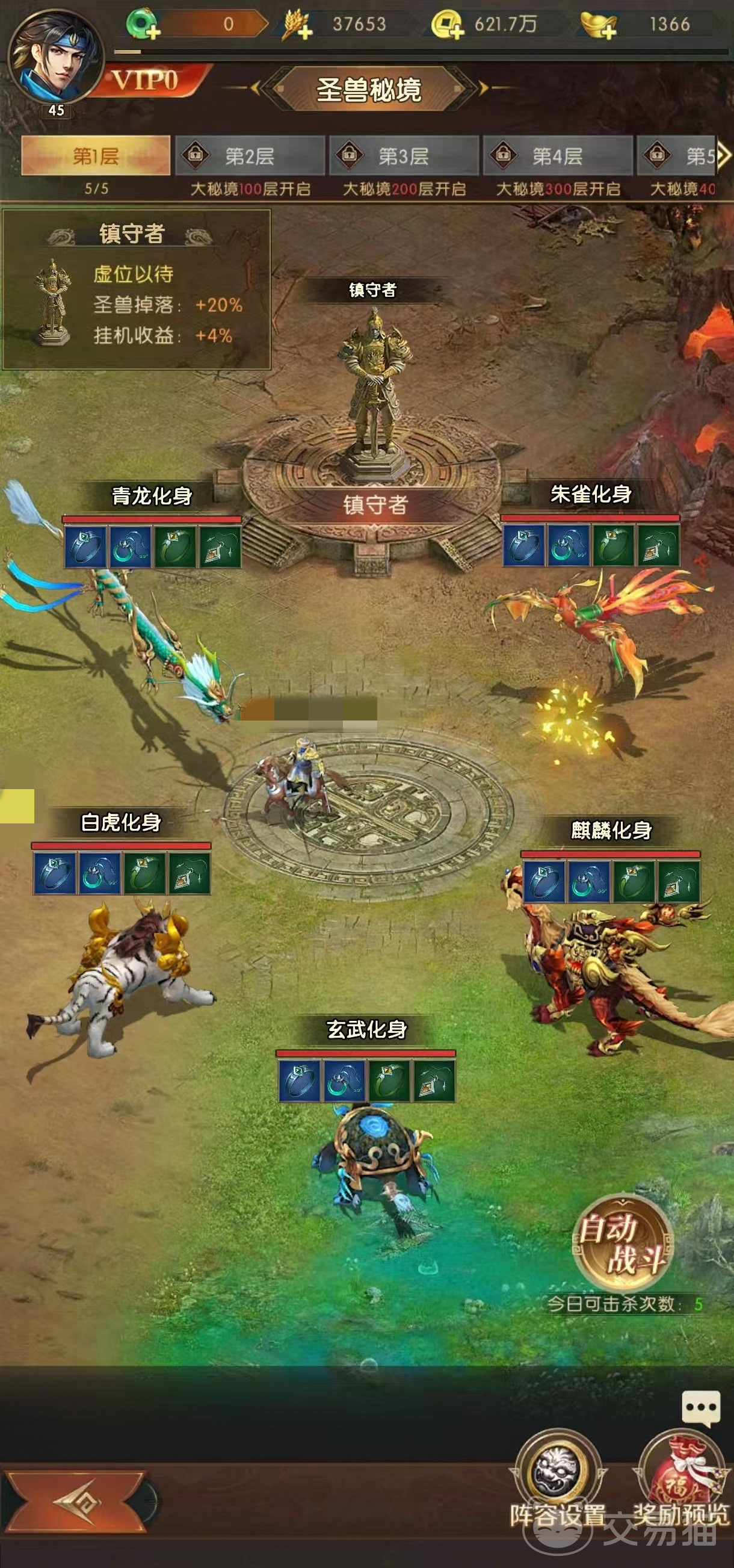 在爬塔达到50层之后,会开放一个圣兽秘境,这里产出的是各种各样的首饰类装备,因为爬塔获取的装备只是防具类型,所以圣兽秘境也需要去打。这里一共有5只圣兽,每天可以击杀5次,最多能够累积10次。击杀圣兽之后不一定会获取首饰装备,通过击败镇守者之后,掉落几率就会增加,还能提升大秘境的挂机收益。